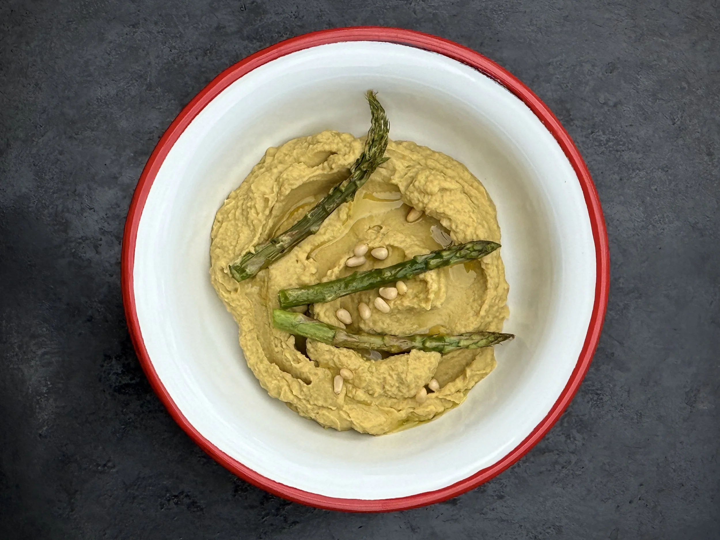 Replacing tahini with avocado and pine nuts gives hummus a new flavor profile and a more richer, creamier texture. Lemon juice adds freshness, while roasted asparagus brings a pleasant spring character to the dish.