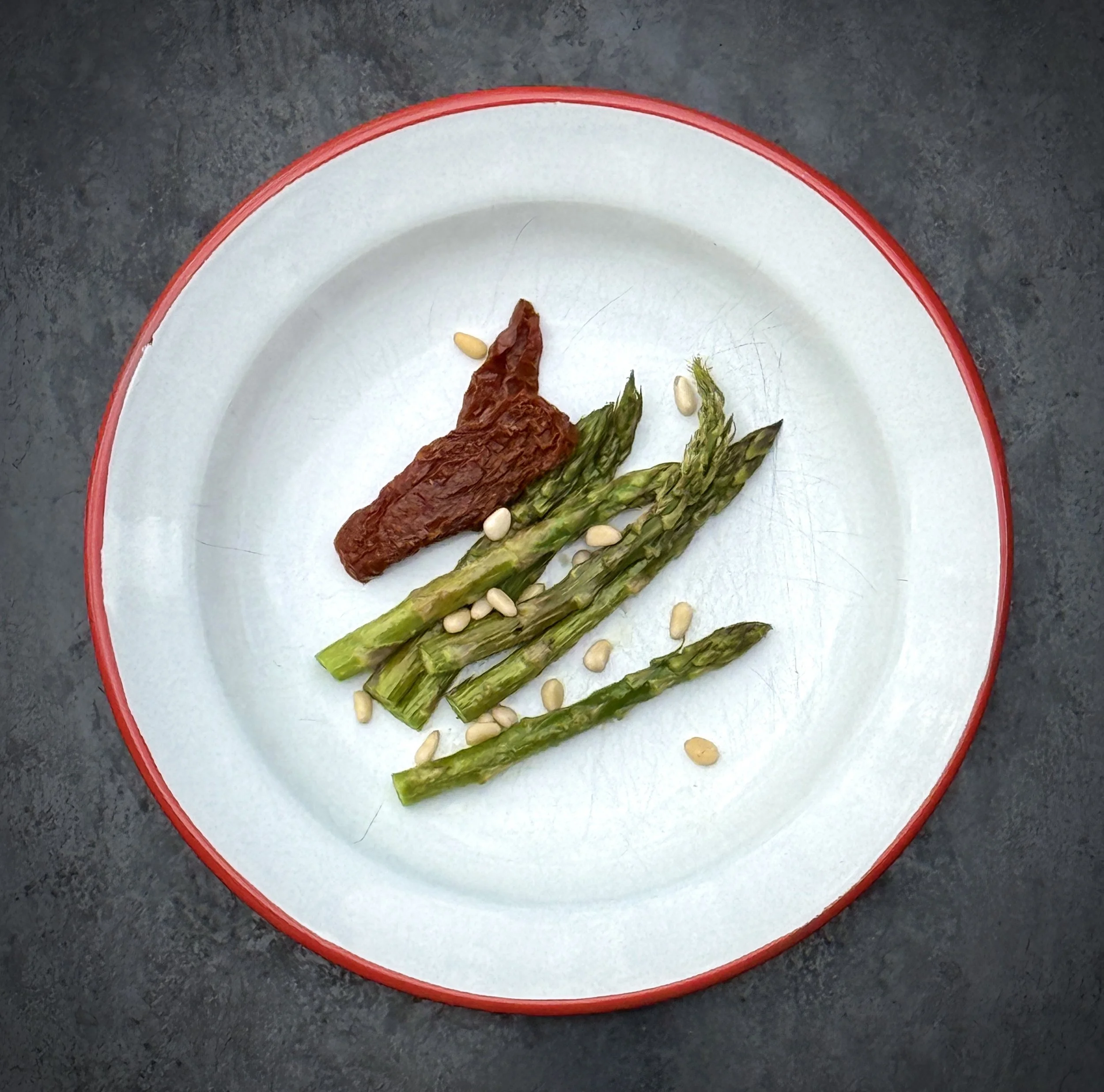 Top with roasted asparagus tips, the remaining toasted pine nuts and a drizzle of olive oil.