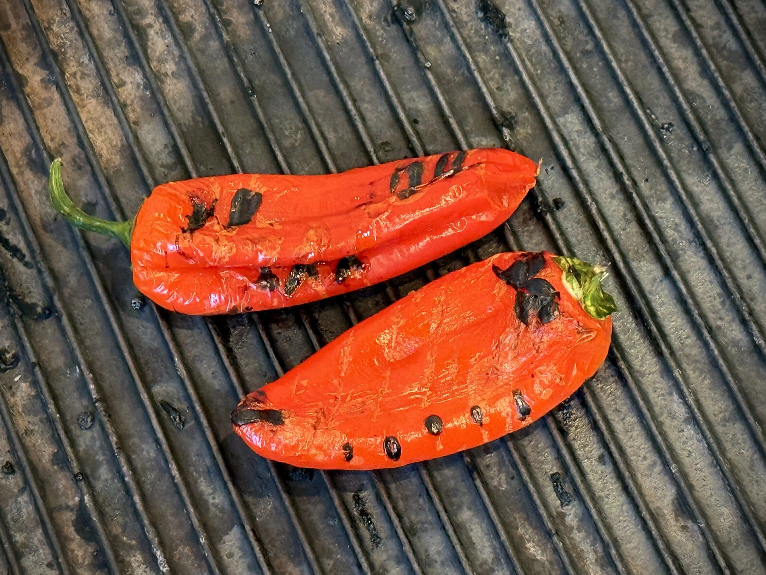 Grill the red peppers and the tomatoes until soft and lightly charred. Sprinkle a pinch of salt and let cool for about 5 minutes.
