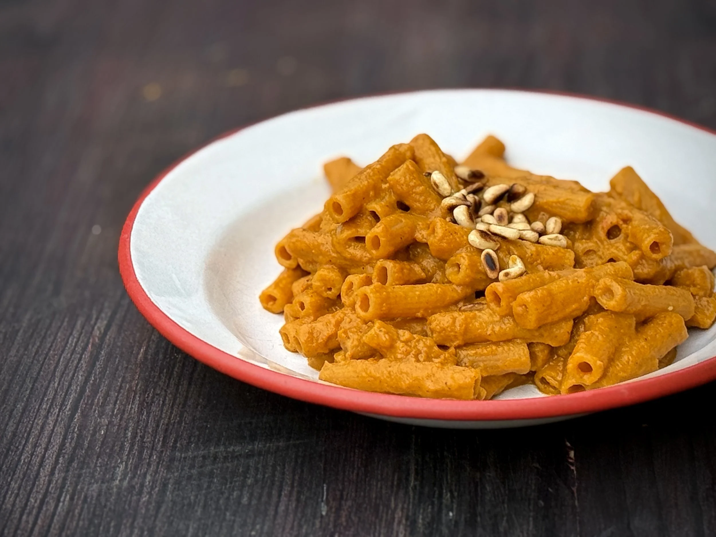 Grilled peppers and cherry tomatoes bring smokiness, gently simmered carrots and onions add sweetness, while avocado and pine nuts make the sauce rich and creamy. A touch of lemon zest adds freshness sending your thoughts to the late summer days.