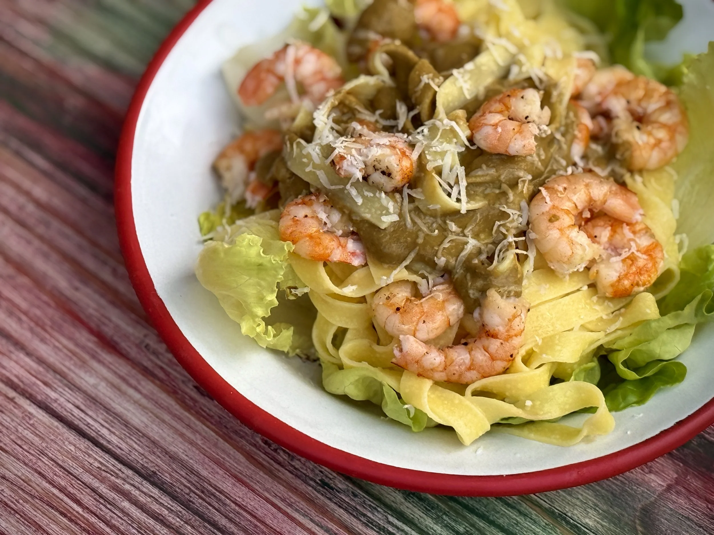 A delicate and light warm pasta salad, where a gentle coating of olive oil and Parmesan meets the roasted shrimps and a pesto-style dressing. The dressing isn’t supposed to coat but rather to complete the pasta, adding a familiar yet surprising kick. Serve over a few crisp lettuce leaves for a fresh contrast.